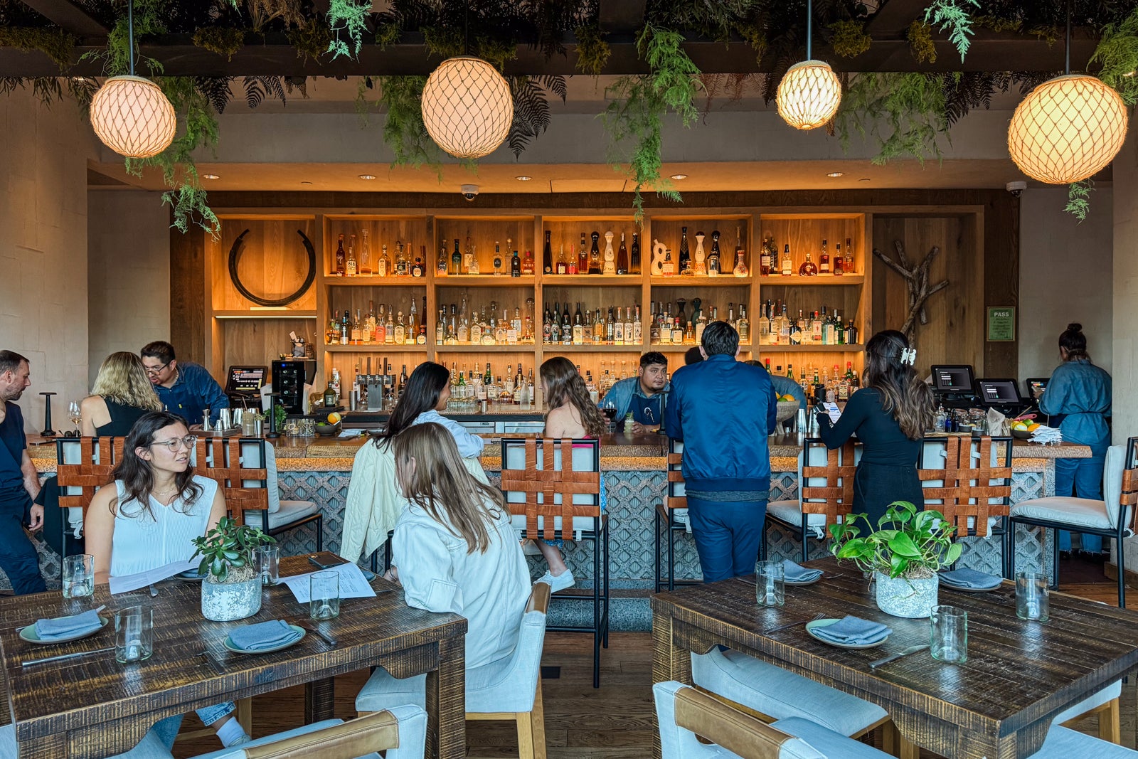The massive inside eating room felt like an indoor backyard get together, that includes a mixture of high and low wood tables with cushioned chairs, a fantastically backlit tiled bar and a profusion of hanging crops and netted orb lights.