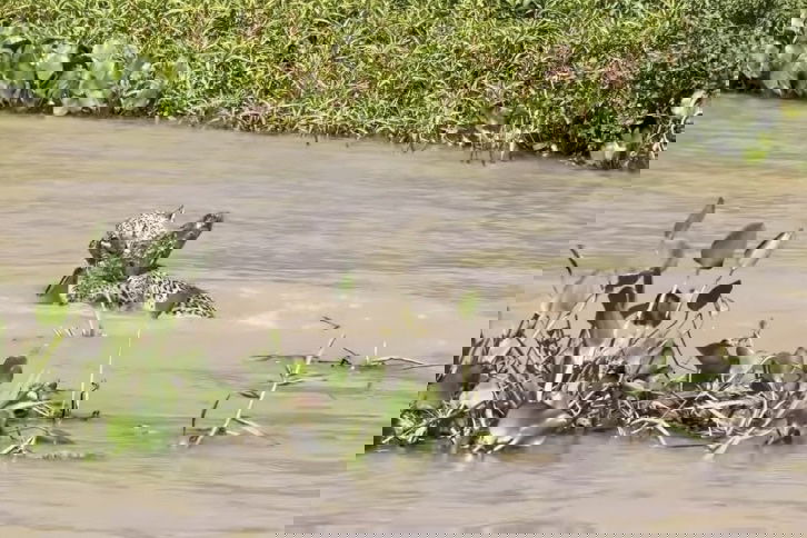 Whereas each caimans and jaguars are extra nocturnal than diurnal, this battle takes place in the midst of the day. The footage reveals a jaguar poised on some vegetation peeking out of the river. Then, it pounces. After a scuffle, you see what the jaguar is searching—a caiman—and the jaguar begins thrashing it round within the water.
